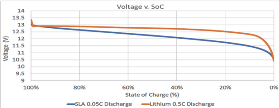 Biểu đồ trên biểu diễn mức hiệu suất từ lúc đầy pin (100%) tới lúc xả hết pin (0%) của ắc quy chì (SLA – đường màu xanh) và pin Lithium (đường màu cam). Điều này cho thấy, pin Lithium mang lại hiệu suất làm việc ổn định trong suốt quá trình hoạt động của xe, trong khi ắc quy chì kém hơn, ngay từ mức 80% đã bắt đầu tụt dần.