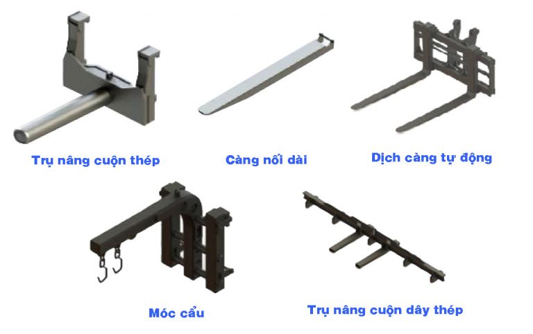 Công việc của 1 chiếc xe nâng không chỉ gói gọn ở việc dùng nĩa nâng, mà nhà xuất đã nghiên cứu để thiết kế thêm những bộ công tác đính kèm, để đáp ứng đa dạng yêu cầu công việc. Một số bộ công tác phổ biến như: Trụ nâng cuộn thép cán, dàn nâng cuộn dây thép nhỏ, dịch càng tự động, móc cẩu, càng nối dài…
