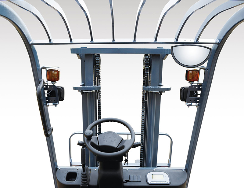 - Khung nâng của xe nâng điện ngồi lái thiết kế thông minh giúp mở rộng góc quan sát cho người điều khiển, tay lái có đường kính nhỏ, đặt ở vị trí thích hợp cho việc quan sát phía trước.