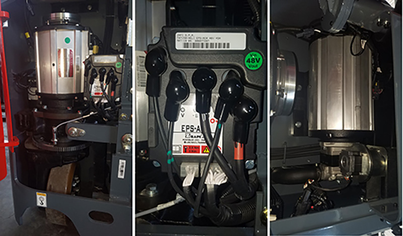 - Toàn bộ hệ thống di chuyển, nâng hạ và hệ thống lái trên xe nâng điện Reach truck được dẫn động bằng motor điện xoay chiều AC ba pha với công suất 5 kW cho khả năng tăng tốc mạnh mẽ, thay đổi hướng đi nhẹ nhàng và nhanh chóng.