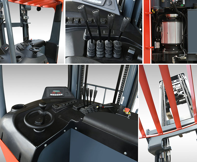 - Thiết kế cabin và khung nâng thích hợp cho việc quan sát của người lái khi di chuyển xe và nâng hạ hàng hóa. Màn hình Tablo hiển thị hầu hết các thông số quan trọng: Vị trí góc lái, chế độ lái, dung lượng ắc quy, mã lỗi, thời gian làm việc…