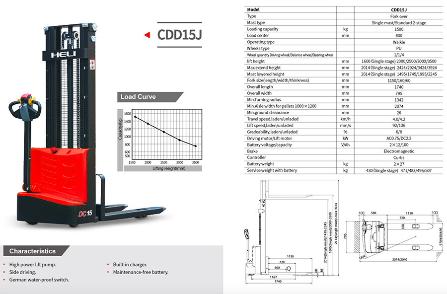 Chi tiết catalogues của xe nâng tay điện cao 1.5 tấn Heli