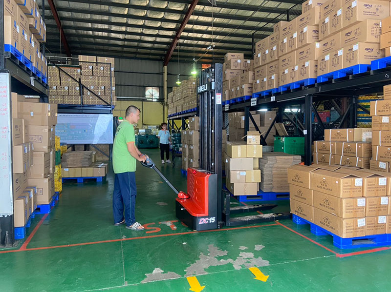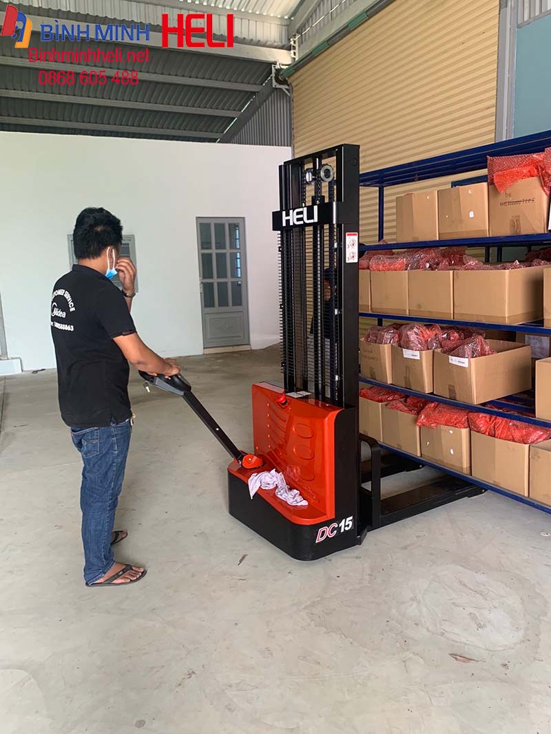 Hình ảnh xe nâng tay điện cao 1.5 tấn Heli tại kho công ty Bình Minh