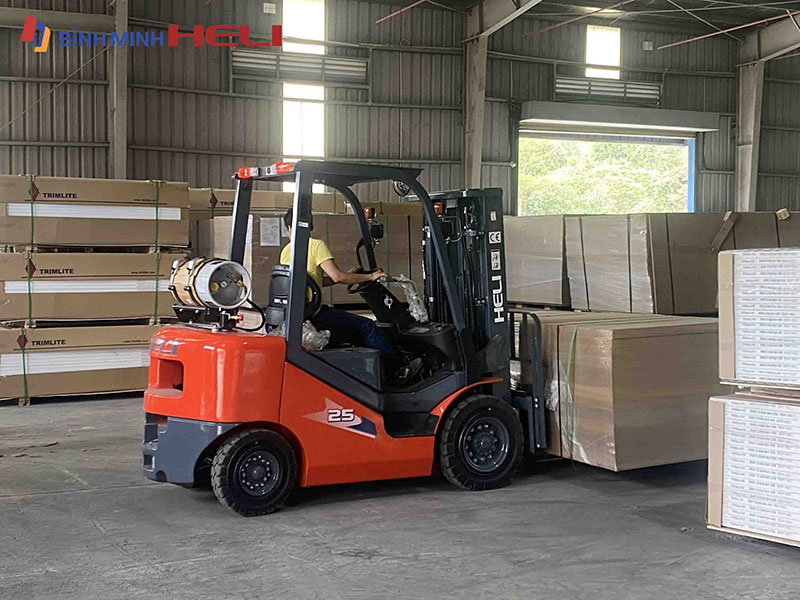 Xe nâng xăng gas 1.5 tấn Heli làm việc tại kho khách hàng